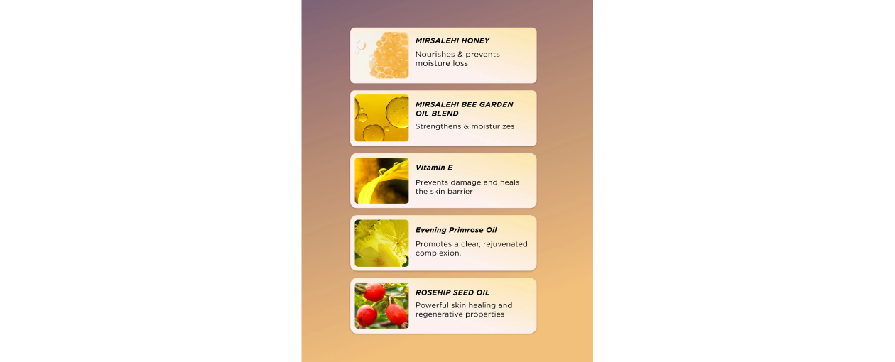 The face oil features a proprietary Mirsalehi Bee Garden Oil Blend, which consists of eight omega-rich oils, including Safflower Oil, Evening Primrose Oil, and Rosehip Seed Oil. Each of these carefully selected oils is freshly cold-pressed, ensuring maximum potency and effectiveness. Cold-pressing is a premium extraction method that preserves the essential nutrients that deeply nourish the skin without using high heat, which can degrade valuable compounds.