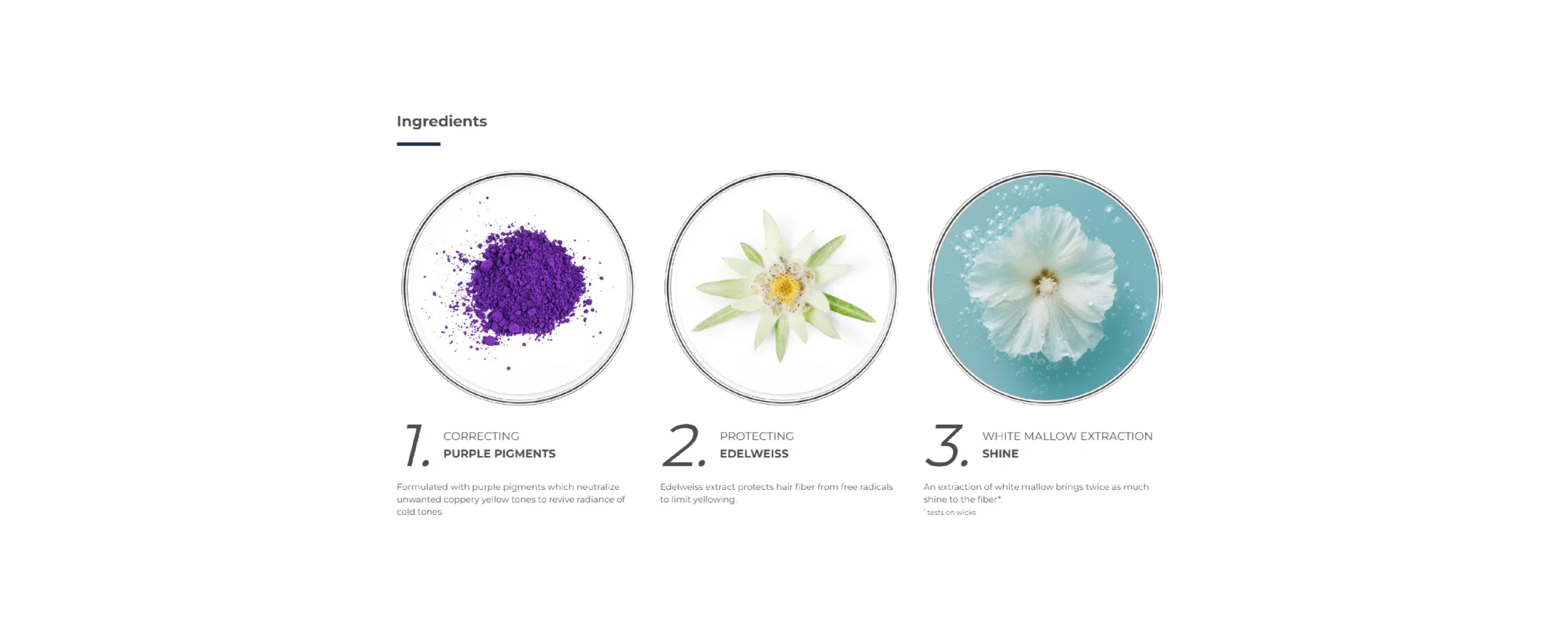 Violet Pigments: These pigments effectively correct yellow and copper undertones, reviving the brilliance of your cool highlights with every use.